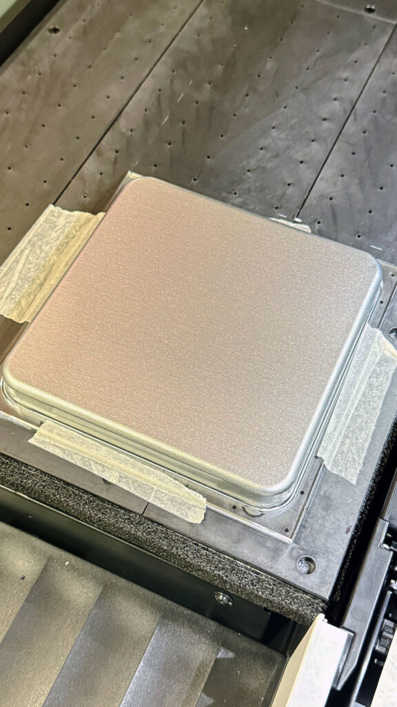 治具にセッティングされたロイヤル缶(クッキー缶)のフタです。印刷範囲が決まっておりますがフルカラーで印刷可能です!もちろんスクリーン印刷で1色刷りも可能です!