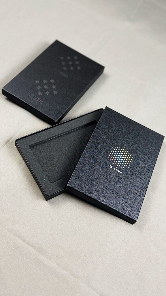 薄型の割に丈夫で高級感のある貼り箱・化粧箱となっております。やはりゴールドやシルバーでショップのロゴなど箔押しするとオリジナル感と高級感が増します!フルカラーUVでも面白いものが出来上がるんですけどね。