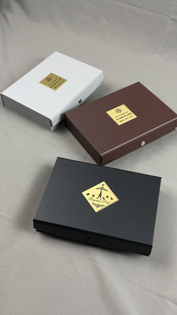 表面は革のようなしっとりとした手触りで高級感があります。カバンに放り込んで持ち運んでも傷が付きにくく紙製の貼り箱でありながらかなり頑丈な作りになっています。