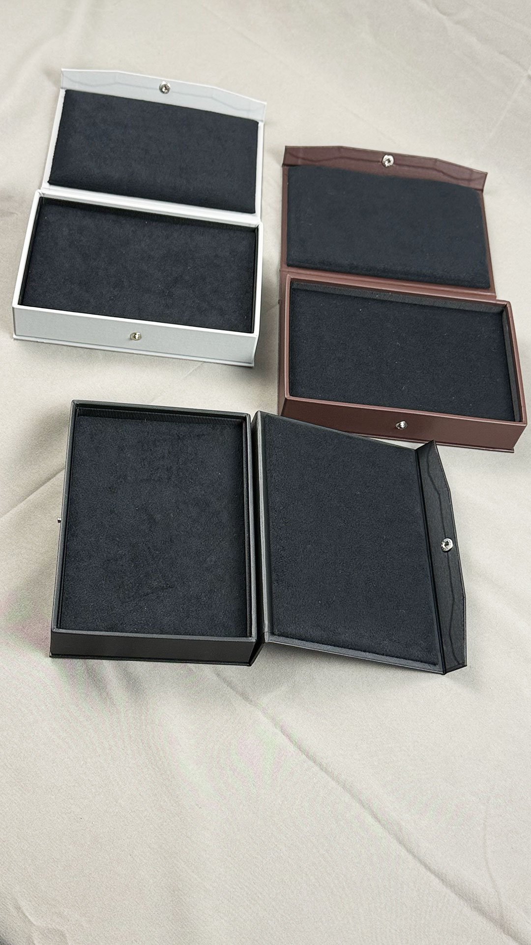 見返し部分にかなり厚めのウレタンが付いております。表面はスエード調で優しい肌触り。商品を挟み込んで優しく固定します。型代が発生しますがオリジナルで落とし込みをカットすることもできますよ!