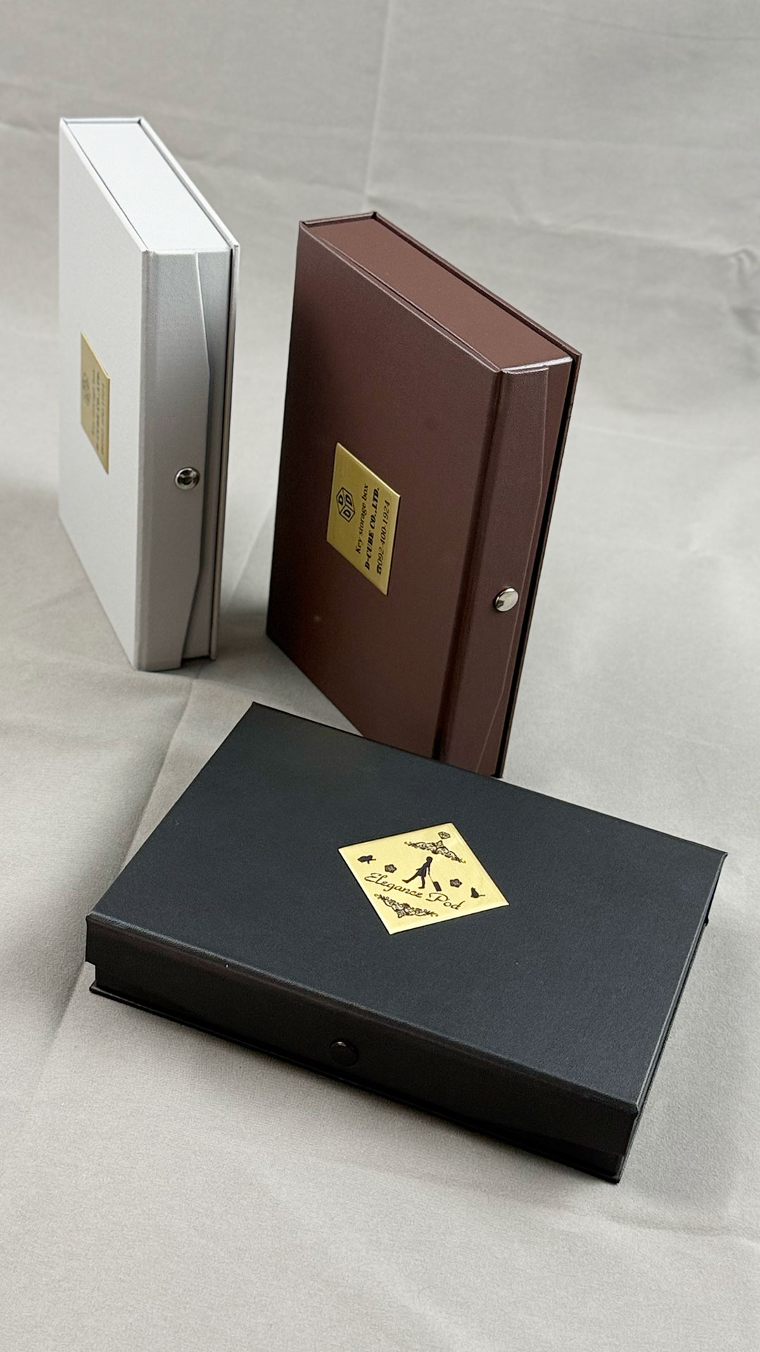 形状的にはブック式ですので本棚にもマッチします。単行本サイズで違和感ありません。少し硬めのホックでフタを固定。中で商品が動くのを防いでおります。
