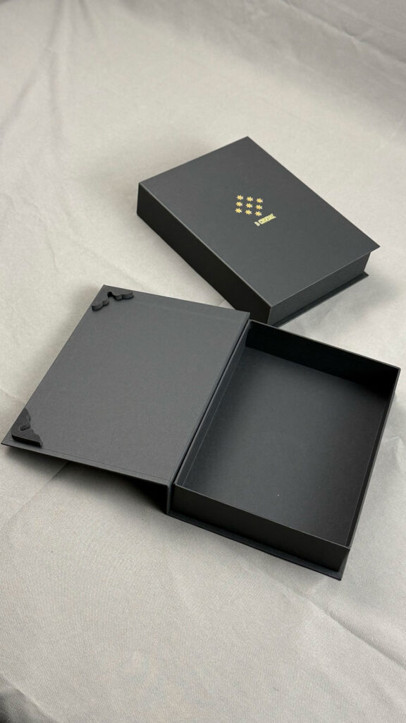 みんな大好きブック式の貼り箱です。やはりオリジナルで作るならこの形で製作してオッっと言わせたいですよね。しかしながら形状も複雑でさらにマグネット仕込むとなると単価がうなぎのぼり!