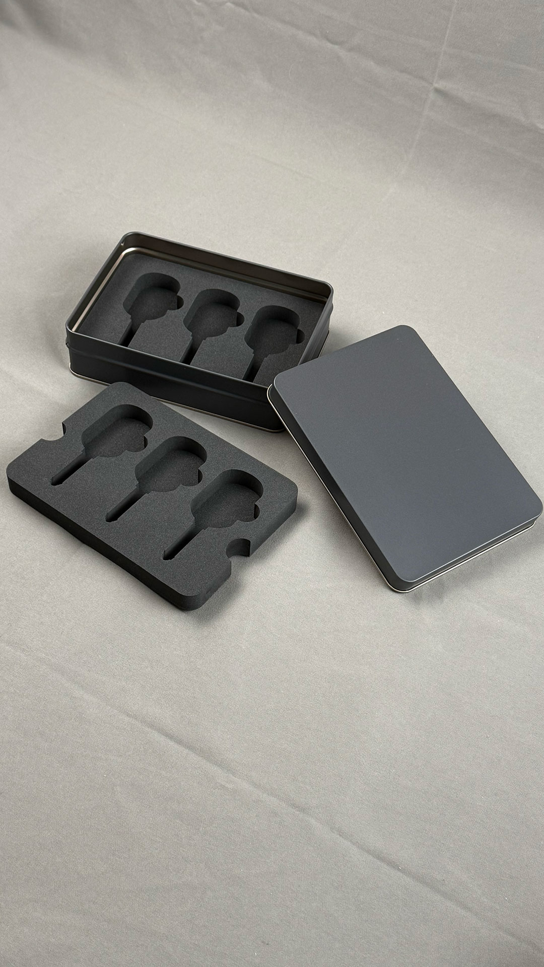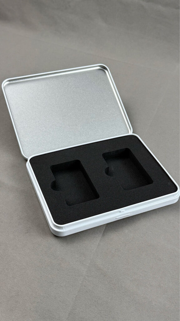 こちらもハガキ缶の中にEVAフォームの中入れ緩衝材。鍵やオイルライター・キャンプ用ツールのパッケージとしてもいけそうですよね。