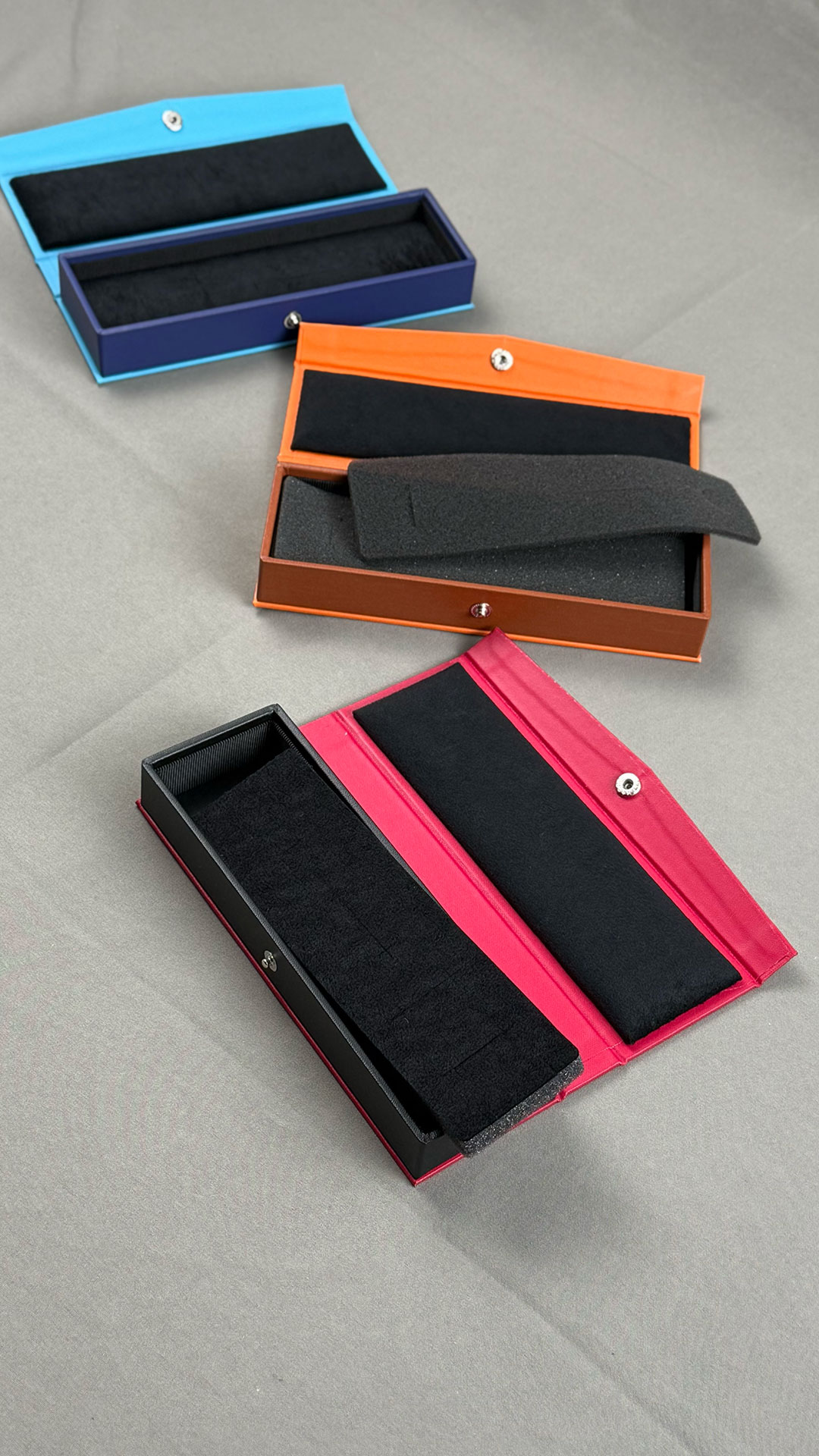 鮮やかな3色展開。ブルーオレンジピンクとなっております。下の黒いやつが中に仕込まれているスポンジでございます。