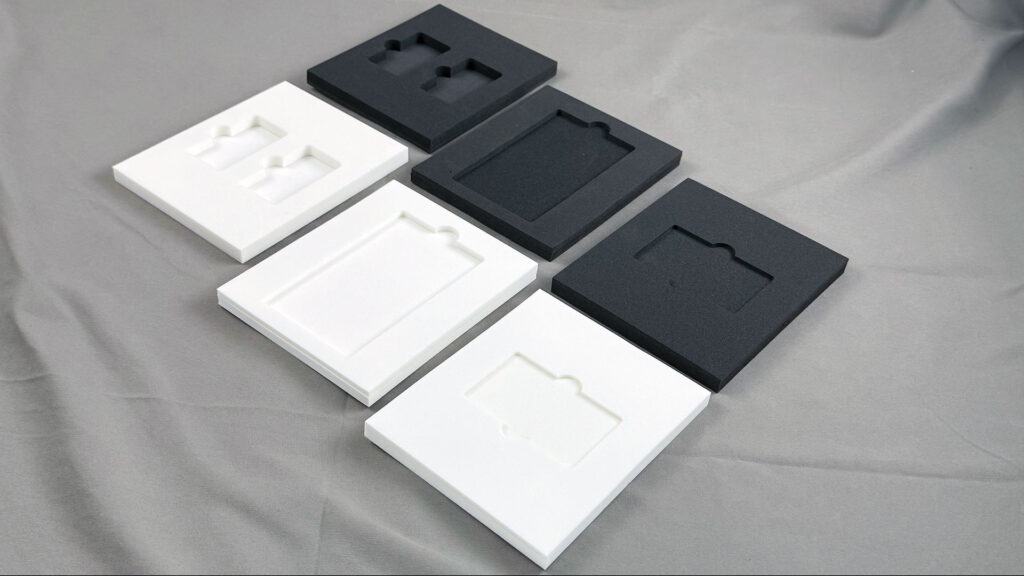 中のEVAフォーム素材はトムソン刃型、少量の場合はプロッターでくり抜くため、数量や用途に応じてカスタマイズ可能。