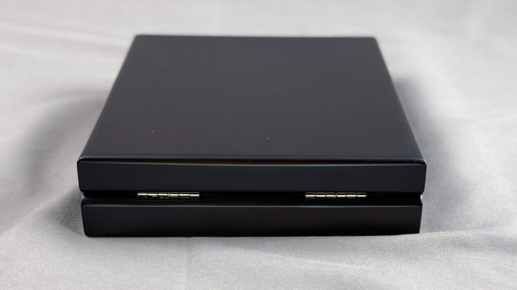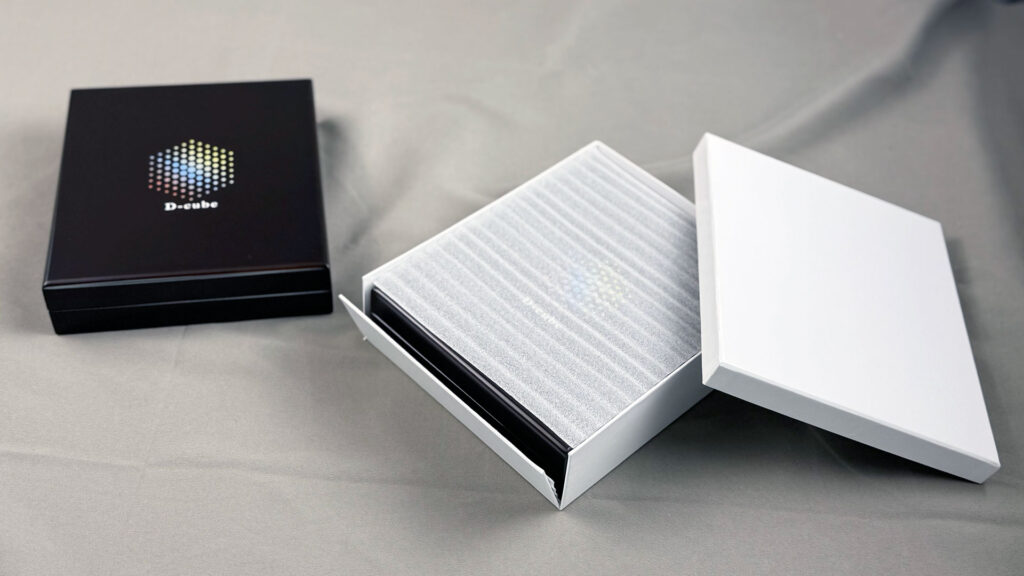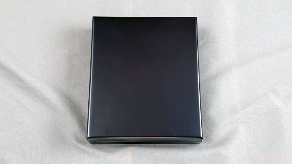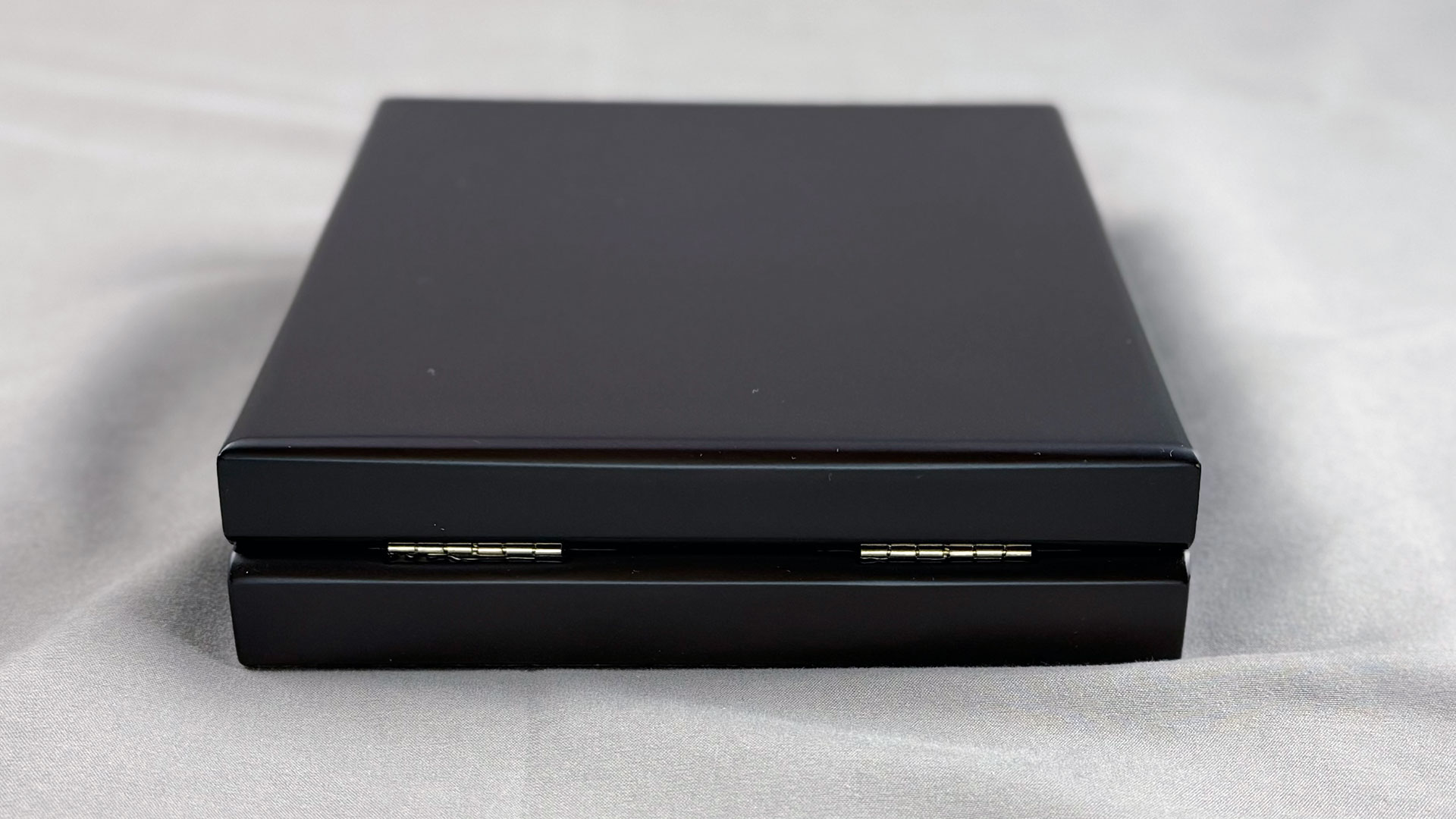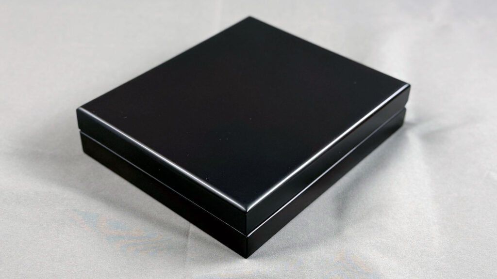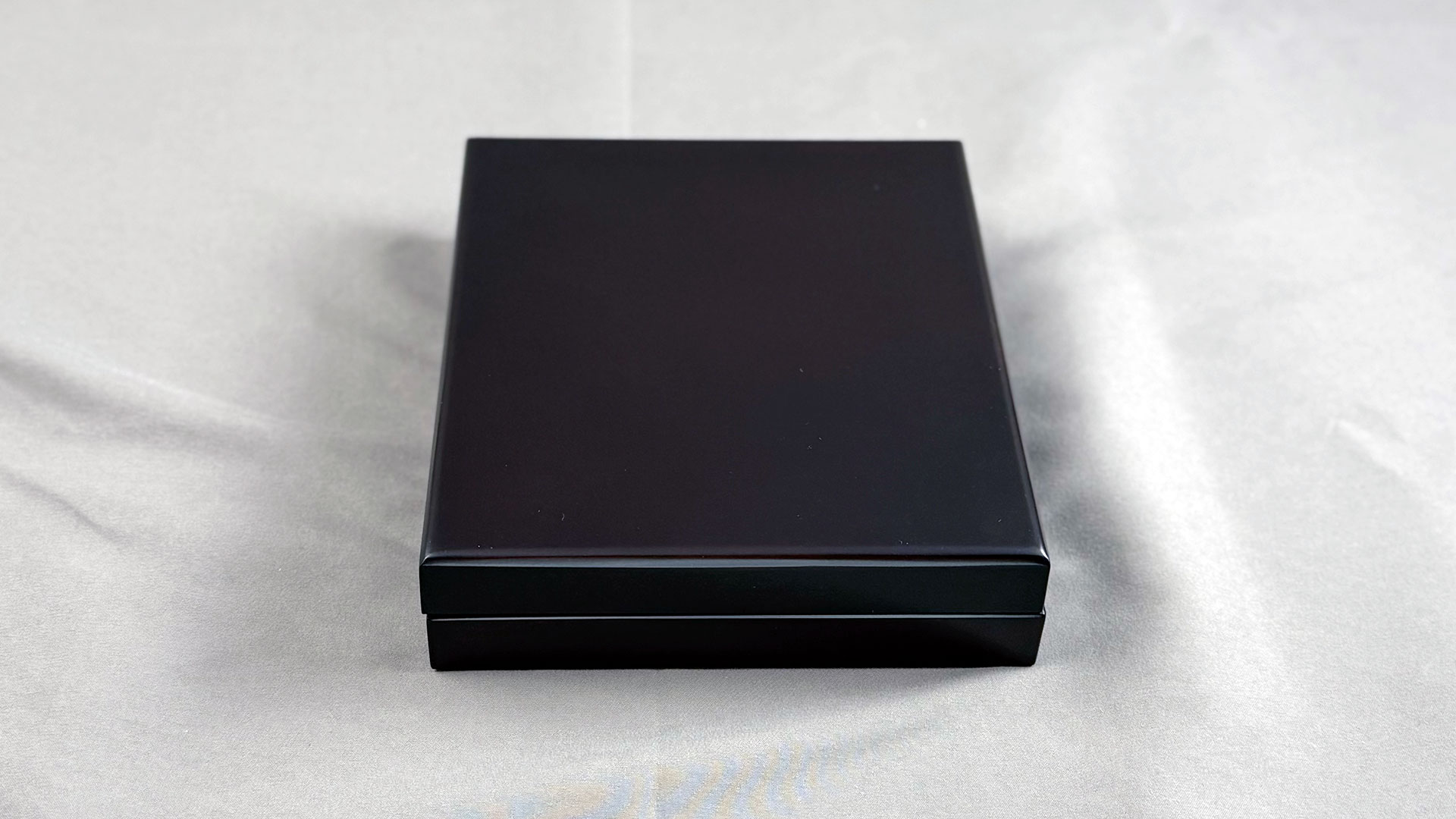 ケースはマットな塗装仕上げ。深みのある重厚感は、安価な既製品とは一線を画します。天面にはスクリーン印刷・UVフルカラー印刷に対応。見返し部分は箔押しに対応。ブランドロゴやイベント記念などの名入れも可能です。